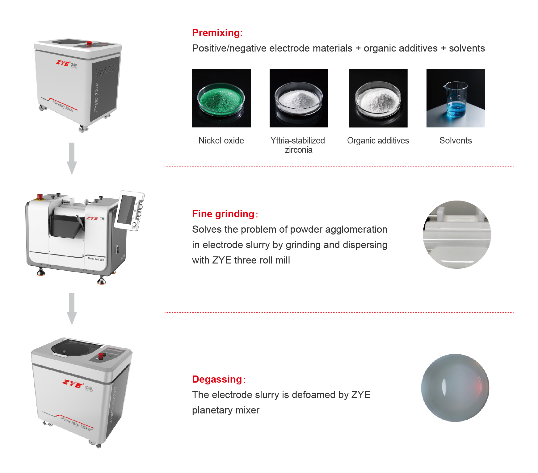 Raw materials – including nickel oxide (a key anode material), yttria-stabilized zirconia (electrolyte/electrode support material), organic additives (to improve slurry rheology and binding properties), and solvent – are fed into a pre-mixing equipment (such as the ZYE Pre-Mixer) according to the formulation ratio. Mechanical stirring achieves initial dispersion and mixing, laying the groundwork for subsequent fine grinding. The core objective of this stage is to ensure the uniform distribution of all raw materials on a macro-level, preventing issues in subsequent processes caused by agglomeration or stratification.