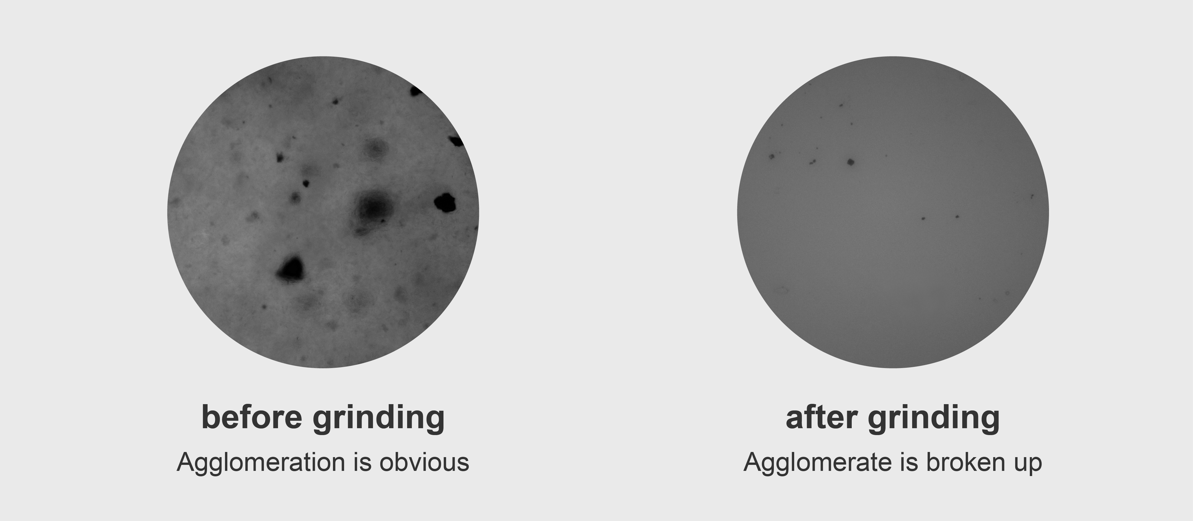 The microscopic images clearly demonstrate a significant deagglomeration and dispersion effect after processing with the precision triple roller mill. The grinded material exhibits greatly improved dispersibility and uniformity compared to the initial state.